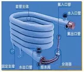 2、将来自压缩机的高压制冷剂蒸气冷凝成液体。在冷凝过程中,制冷剂蒸气放出热量,故需用水或空气来冷却。