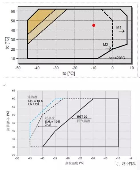 然后我们再来看不同品牌的压缩机的允许运行范围。下面两个图分别是某品牌的半封活塞压缩机和美优乐压缩机的运行范围,我们可以很容易的发现, 两种压缩机允许的低压上限并不同,也就是说两种压缩机所需要的MOP点不同。而我们示例中的热力膨胀阀的MOP点是固定的,只有针对大型OEM客户才有可能按照客户要求进行定制。