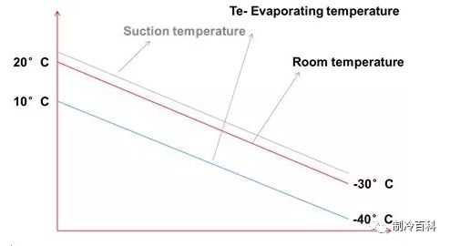 我们假设一个低温零下30度速冻的应用,拉温的过程如下图所示。假设蒸发器的换热温差保持在10K,理想当中或者理论当中的温度变化过程则如下图。