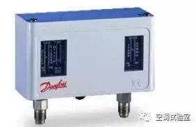 压缩机高低压保护 压缩机常常需要保护,以防止冷凝压力过高或者进气压力过低。 实现的方法是使用两个单压开关或者一个双压开关。开关有多种 电气接触类型。这里看到的是一个简单的类型。高压和低压开关组合在一个壳体内。