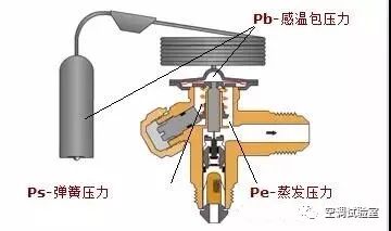 热力膨胀阀能控制液态制冷剂从冷凝器注入蒸发器。 膨胀阀能让蒸发器出口处的过热度保持在一定水平, 防止液态制冷剂离开蒸发器进入压缩机。一旦液态制冷剂进入压缩机,便会发生液击。必须防止这种状况 发生,以免压缩机损坏。 Pb-感温包压力 Pe-蒸发压力 Ps-弹簧压力 Pb = Ps+Pe, 膜片不移动。 当感温包压力上升,导致 Pb > Ps+Pe 时,膜片向下移动,阀门打开,更多制冷剂流入蒸发器。 当感温包压力下降,导致 Pb < Ps+Pe 时,膜片向上移动,阀门关闭,流入蒸发器的制冷剂减少。
