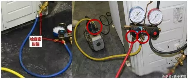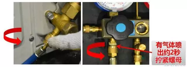 4、待压力表端软管有气喷出2秒左右拧紧所有软管(排掉软管空气)。