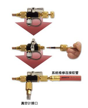 当系统和真空泵连接无误后,即可开启真空泵开始抽真空。直至真空压力下降到133Pa的水平(如果使用大直径软管和球阀工具,对于制冷量高达5吨的典型家用系统来说,热交换器的抽空时间不到15分钟)。 使用球阀工具断开真空泵与系统的连接,并观察真空度的变化情况(一般观察5分钟),若压力升高表明系统中仍然存在水汽或小的系统泄漏。