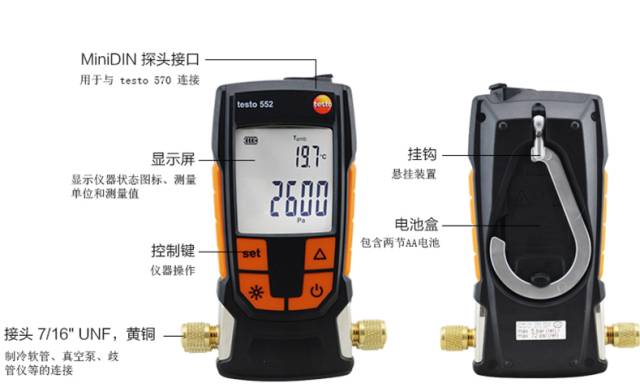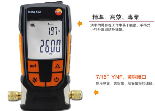 德图testo 552 数字式真空表,适用于制冷及热泵系统的真空度检测。除此之外,用户还能精确判断系统的除湿程度及杂质的去除程度 ,例如:油,杂质气体等。