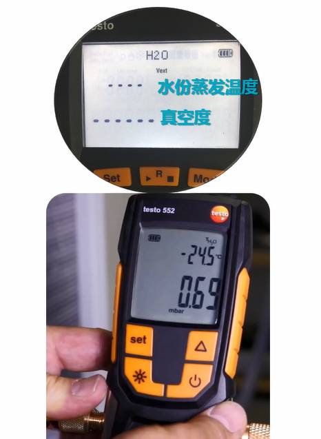 使用精密稳定的真空计,如本页显示的德图数字真空计testo 552,得益于仪器的高灵敏度,可以比压力表更快地指示泄漏。如果发现真空下有泄漏,则需通入高压干燥氮气,在系统处于压力状态下重新查漏。(注意:不要在真空状态下通入环境空气!)如果系统有泄漏,真空计将继续升高,直到达到大气压力。