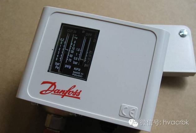 压力控制器用作压力控制和压力保护之用,机组有低压和高压控制器,用来控制系统的压力的工作范围,当系统压力到调定值时,开关自动切断(或接通)电路。